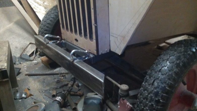 Немного переделал дуги тента (удленил одну), а то при посадке, сын уперался в дугу головой. Поставил боковые ручки, вварил в раму закладные гайки для крепления кузова. Накинул тент, шить буду по месту. Так же изготовил фальшь залевную горловину из ступечного колпочка ваз 2101-07 и военного электроразъема, в планах через неё производить зарядку АКБ.