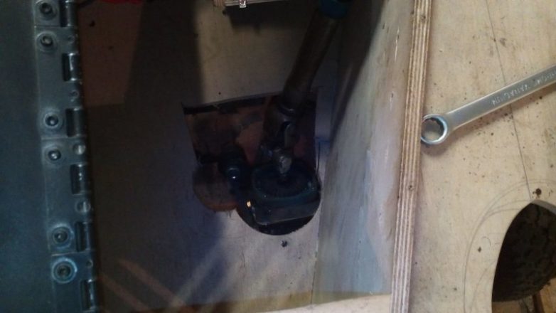 Рулевой редуктор из стеклоподъёмника всем хорош, довольно легко поворачивал колёса, но от упора до упора было 3,5 оборота, сыну сложновато столько крутить руль. Новый сделал из редуктора от балгарки. Теперь от края до края 1.2 оборота руля.