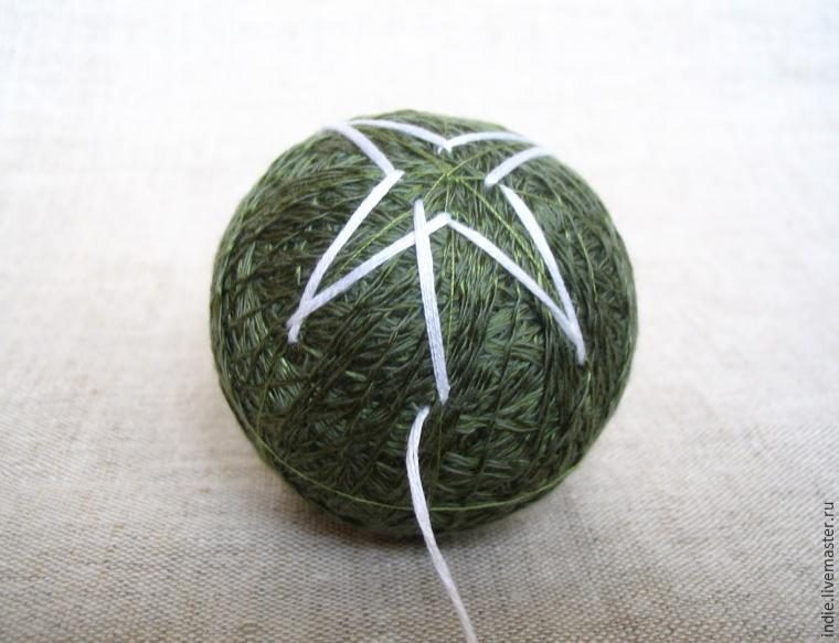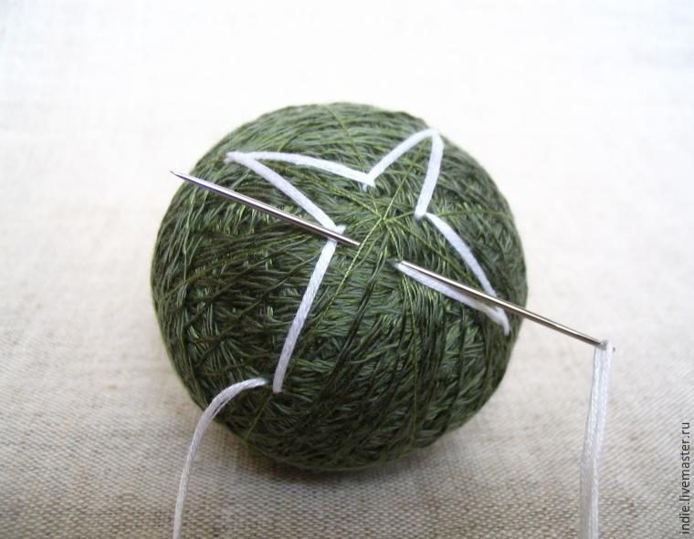 Теперь делаем собственно разметку нитками. Если не хотите, чтобы их было видно на готовом изделии, возьмите нитки или чуть-чуть отличающиеся от нитей основы по тону или такие же по тону, но другого типа. Важно, чтобы вы их все-таки могли различать на шаре. Также разметка может сама по себе стать элементом узора, если взять, к примеру, тонкую металлизированную нить.