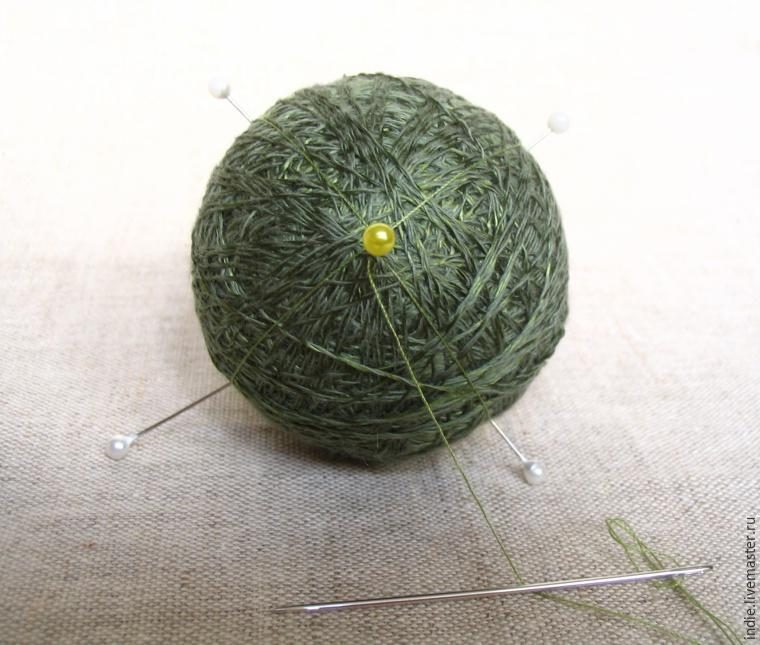 Обматываем экватор, так же закрепляя нить в двух местах. Завязывать узел на конце нитки не требуется, просто выведите ее на расстоянии 3-4 см от последнего стежка и обрежьте. Булавки можно вынуть.