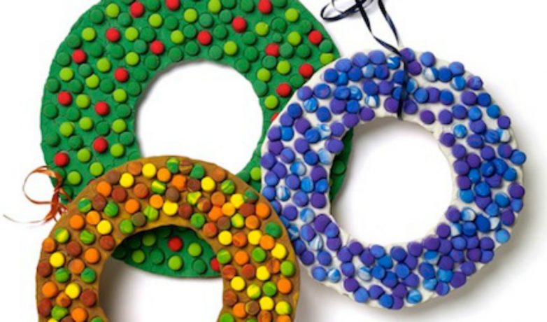 18. Если скатать множество шариков из полимерной глины разного цвета, то потом их можно приклеить на картонные венки, любовно вырезанные мамой или папой. Получится прекрасное украшение на дверь или стену.