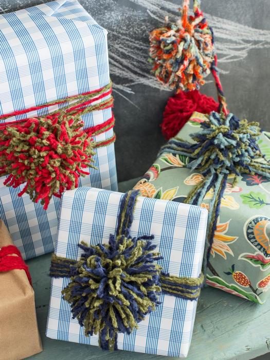 Помпоны из пряжи на новогодних подарках.