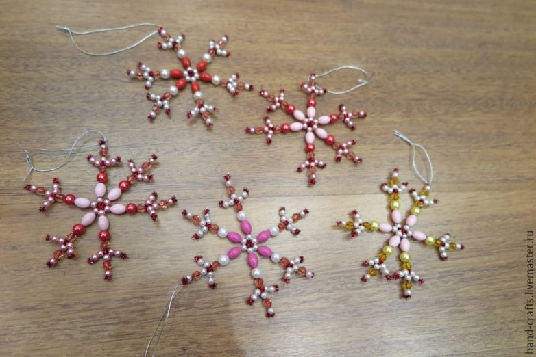 — 6 крупных круглых бусин (предпочтительно цветных; все одного цвета, но не белые; если эти бусины белые, то предыдущие точно должны быть цветные, иначе снежинка получится бледной и невыразительной);