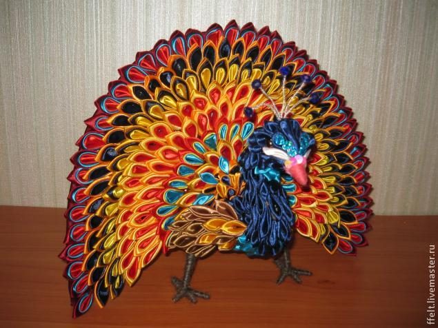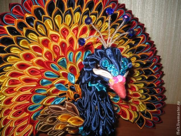 Хочу поделиться с Вами своим опытом по создания жар-птицы и павлина в технике канзаши. Эти птицы вызывают массу восторженных отзывов среди моих клиентов и друзей, поэтому я решила сделать доступной технику его создания и для других мастериц.