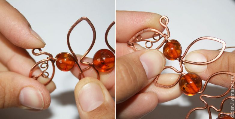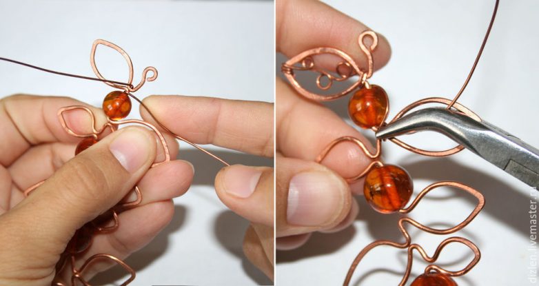 Теперь проволока должна хорошо держаться и сама вокруг листа, можно отпустить второй конец и изогнуть узор. Для этого захватываем круглогубцами место на проволоке недалеко от основания и оборачиваем проволоку вокруг, чтобы получилась петелька, после нее направляем проволочку к кончику листа. Потом отступаем и уже с другой стороны делаем захват круглогубцами и оборот и так далее. Обычно, в лист помещаются 2-4 петельки, чем ближе кружочки друг к другу, тем симпатичнее это выглядит.