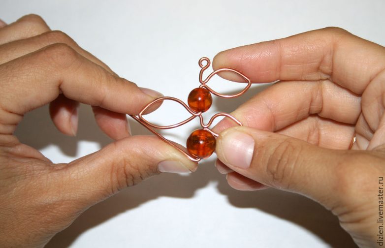 Оптимальное количество «ягодок» — это 5 шт, но можно и больше, тогда будет шире. Если у вас, как и у меня, бусины разные по размеру, то надевайте их по мере увеличения к центру. Когда наша веточка закончена, то на конце делаем такую же петельку что и в начале и обрезаем лишнюю проволоку. Веточку немного изгибаем, примеряем, как она будет лежать вокруг шеи.