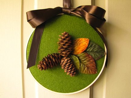 Подвесное украшение на дверь, из шишек, старого обруча, фетра, лент, искусственных листьев.