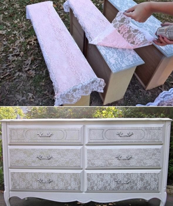 Для начала понадобится сам комод, клей, старый тюль с узорами, наждачную бумагу, краска любая (подойдет баллончик краски), немного фантазии и терпения. Берем наждачную бумагу и начинаем легкими движениями шкурить его поверхность. Как только вы закончите с этим, переходите ко второму этапу и наверно самому интересному. Обклеиваем комод тюлем и начинаем распылять краску из баллончика. Как только вы закончите это делать, снимите аккуратно тюль, и ваш комод будет на глазах преобразится и заиграет совсем новыми красками. Теперь у вас не старый комод, а новый очень интересный и совсем необычный предмет мебели.