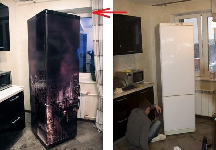 Нужно купить самоклеющуюся бумагу, желательно под мрамор или которая подходит к интерьеру, и полностью обклеить ею холодильник. Очень оригинальная и совсем простая идея для декора.
