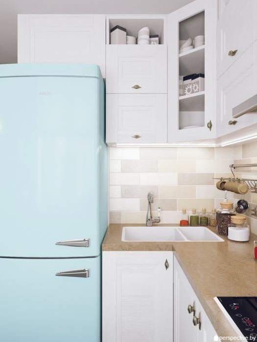 В крошечной кухне пользу должен приносить каждый уголок. Занять углы можно несколькими способами: установить раковину, сделать на заказ угловой гарнитур, поставить мягкий диванчик для столовой зоны. В конечном счёте, установить несколько открытых полок и выставить на них банки со специями, чтобы всегда были под рукой.