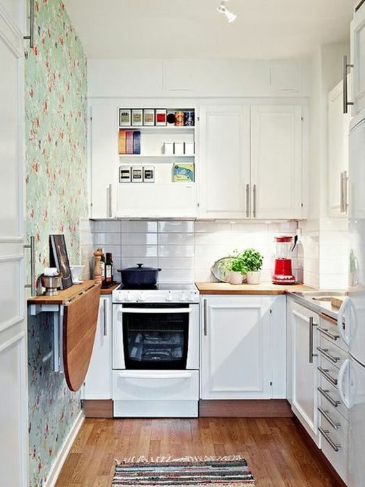 Ещё один мобильный предмет мебели, который станет просто незаменимым на маленькой кухне – выкаткой столик. Используйте его, как рабочую поверхность и как обеденный стол, а когда он вам не нужен, то просто закатывайте. При этом интерьер 100% смотрится аккуратно и не загромождённо.