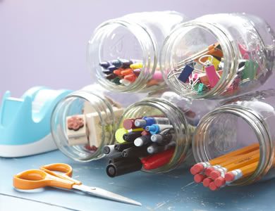 Мы часто используем стеклянные баночки для хранения пищевых продуктов, специй, но они отлично подойдут не только для этого. Прозрачные емкости удобно использовать для сортировки различных мелочей – будь то шурупы и гайки или канцелярские принадлежности и другое. Банки можно декорировать или подписывать, но это совершенно не обязательно. Зачастую они отлично смотрятся в своем первоначальном виде. Опять же, важную роль играет композиционное решение. Если вы хотите добиться оригинального вида, то вот идея!