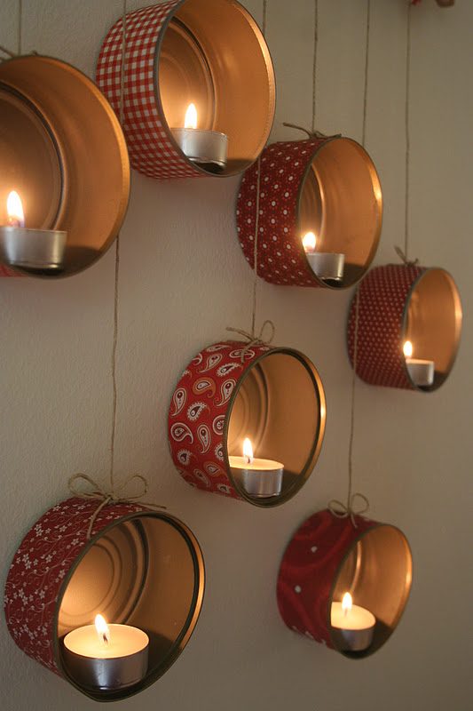 15. Посмотрите, какая оригинальная идея использования жестяных банок в качестве подсвечников! Такие подсвечники можно укрепить на стене на постоянной основе, а можно, как на фото, подвесить за веревочку на разном расстоянии друг от друга, закрепив на одной планке.