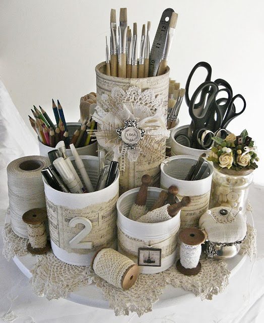 7. Мы все знаем, как иногда трудно организовать рабочее пространство, усмирив все подручные материалы и инструменты. А с помощью разных по объему декорированных жестяных банок, проблема наведения порядка на столе разрешиться раз и навсегда.