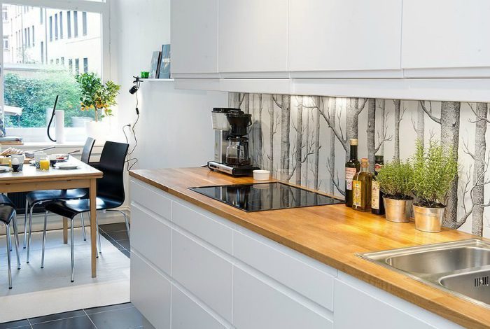 Клеенка, аккуратно наклеенная в зоне кухонного фартука, — копеечный способ, способный преобразить интерьер пищеблока.