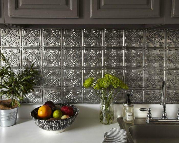 Пенопластовые панели, покрашенные в стильный металлический оттенок, — оригинальное и бюджетное решение для отделки кухонного фартука.