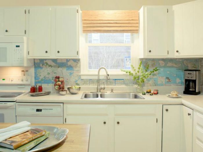 Оригинально оформить кухонный фартук поможет карта мира. Единственный момент, о котором необходимо позаботиться — это хорошее водоотталкивающее покрытие.
