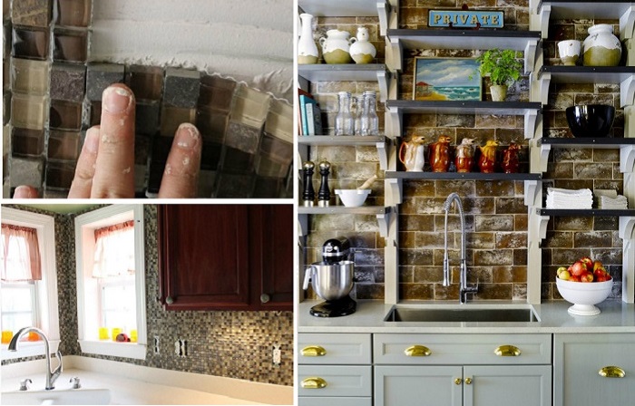 Использование обломков старой керамической посуды в комплексе с декоративной штукатуркой — оригинальный способ создания собственного эксклюзивного дизайна кухонного фартука.
