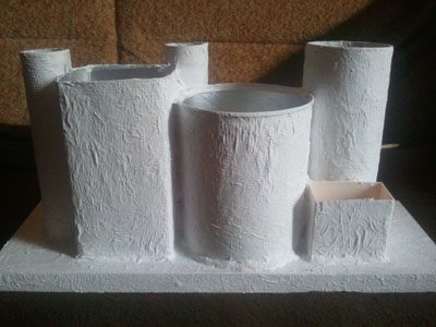 Приклеиваем коробки и банки клеем-пистолетом на основание из ДСП.