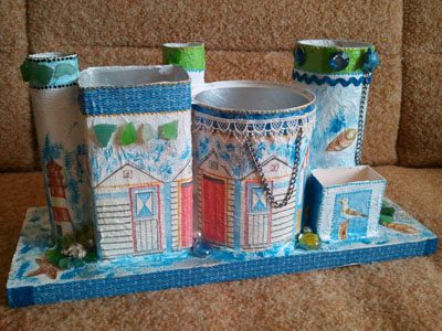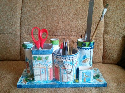 Как же жалко выбрасывать разные упаковки. А ведь это- прекрасный материал для творчества. Посмотрите, какую подставку для канцтоваров можно сделать из мусора:-)).