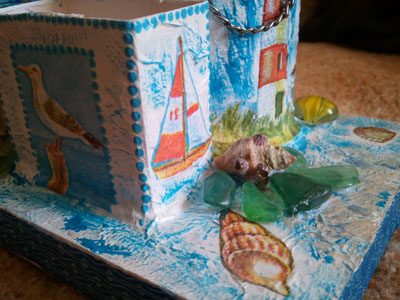 Начинаем «декупажить». Подбираем салфетки с нужными рисунками. Так как я делала подставку в морском стиле, то клеила маяки, пляжные домики, чаек и ракушки.Когда декупаж высох, делаем тонирование акриловой краской голубого цвета, затем серебряной.