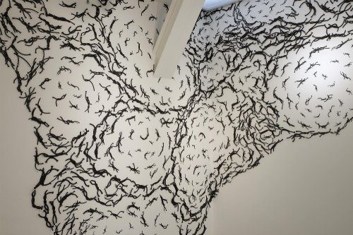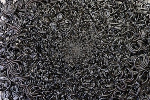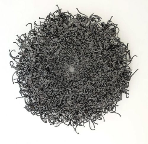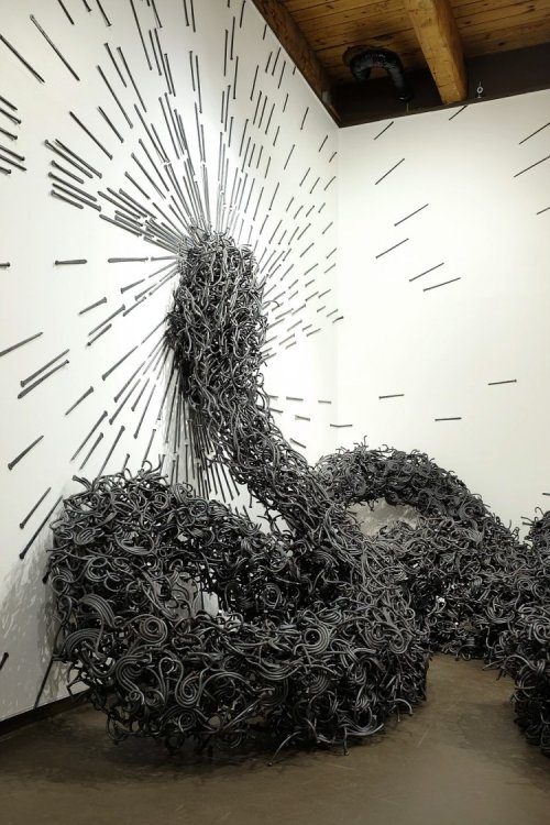 В числе его работ есть и несколько довольно крупных инсталляций, которые трансформируют жёсткий, архитектурный материал в загнутые органические формы. Издалека скульптуры из гвоздей смотрятся на удивление мягко и податливо, правда?