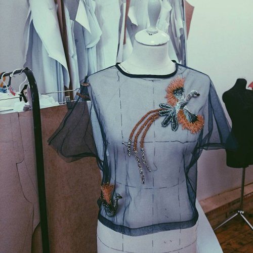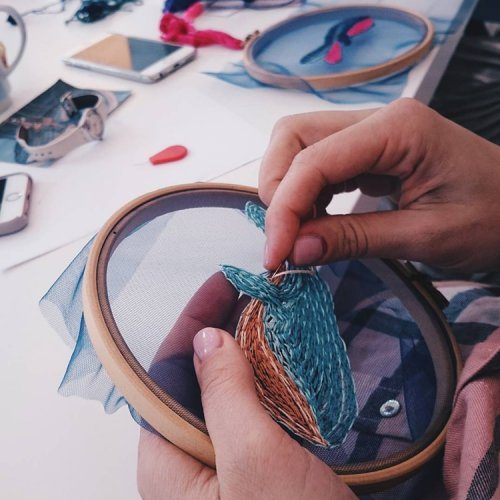 Помимо красочной вышивки, Екатерина Марченко украшает свои творения блёстками, бусинами и нитками с металлическим эффектом. После завершения работы она вытаскивает нити сетчатой ткани из вышивок, получая вышитые декоративные элементы для своих изделий.