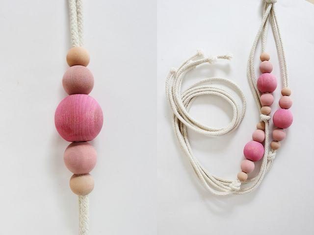 Чередуя разноцветные деревянные бусины и отрезки медной трубки, украсьте каждую пару веревок. В этом случае лучше использовать бусины небольшого размера, чтобы их диаметр ненамного превосходил диаметр трубок.