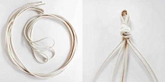 Разделите каждую из пар веревок и свяжите их с веревками из соседних пар. Повторите то же самое, слегка сместившись вниз. Свяжите все веревки в один узел.