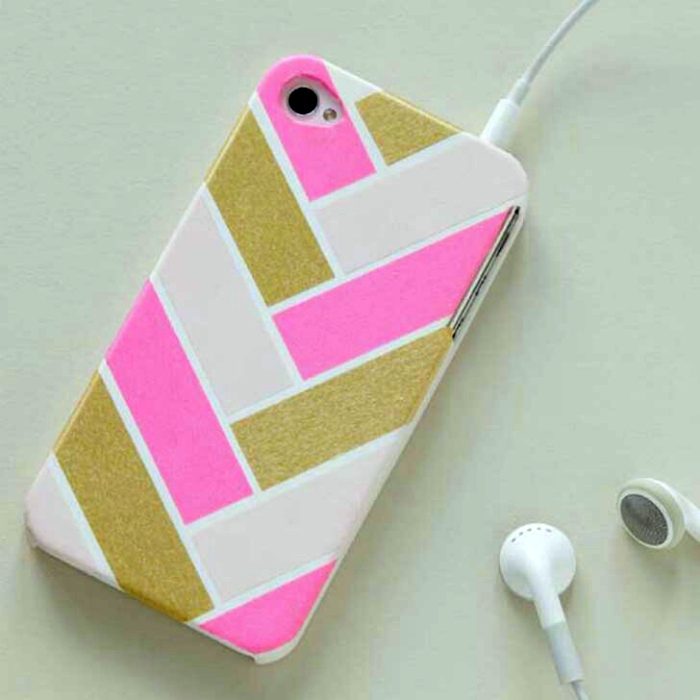 Разноцветные полоски декоративного скотча превратят самый простой чехол из пластика в стильный и необычный.