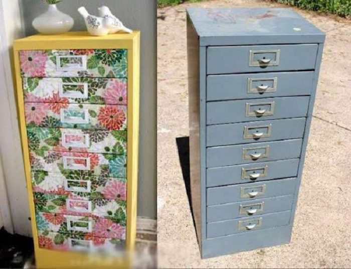 Смените цвет, замените крепление ручек, а по бокам с помощью трафарета можно сделать узор на основном цвете комода.
