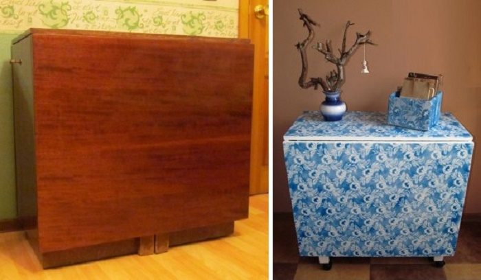 Прикрепите колесики, чтоб легче было перемещать его и раскрывать, перекрасьте стол в один цвет, а далее с помощью трафарета и другой краски сделайте узоры. Еще вариант просто обклеить стол самоклеющейся пленкой любого дизайна.
