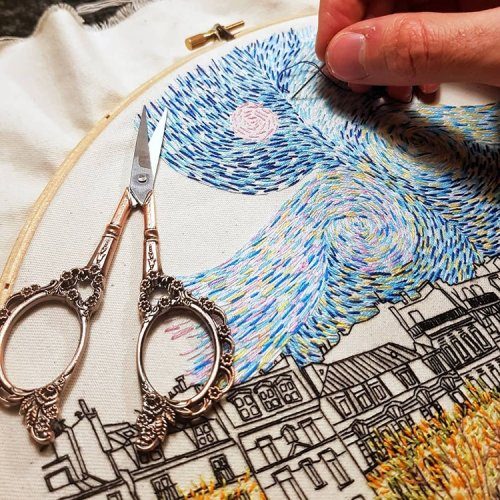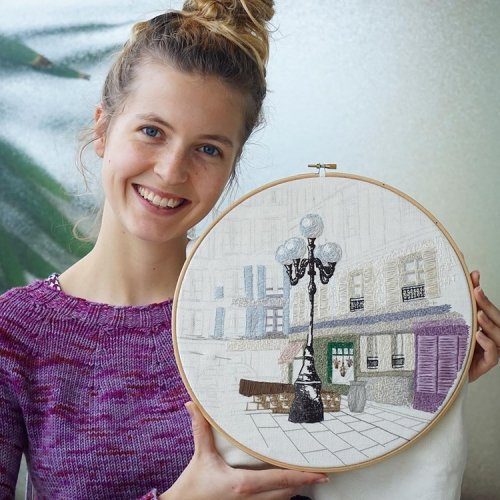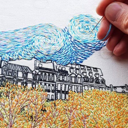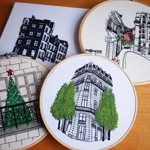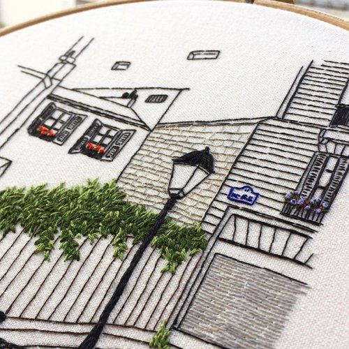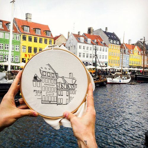 Их совместный дуэт, известный как Le Kadre, призван «вдохновлять и мотивировать людей к созиданию». Каждый вышитый городской пейзаж иллюстрирует любимые места, улочки и здания, найденные в разных европейских городах, по которым путешествует пара.