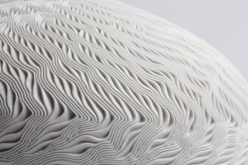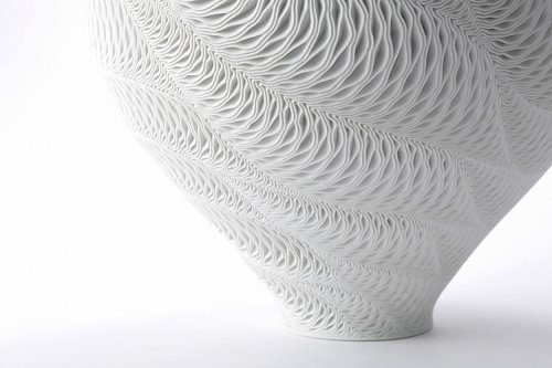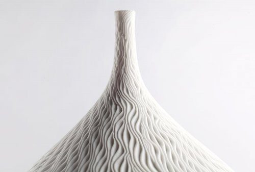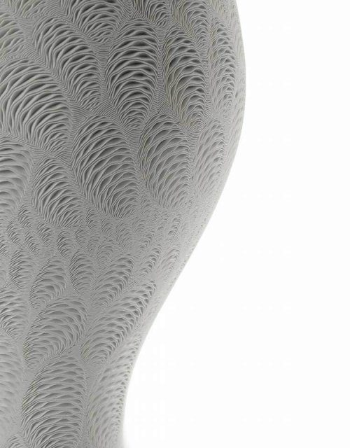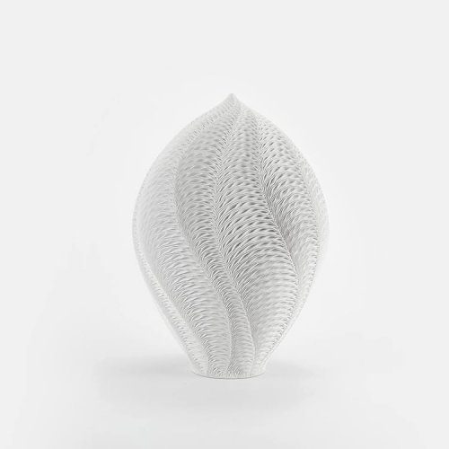 Полностью белые сосуды каплевидной формы искусно изготовляются из фарфора на гончарном круге, а затем тщательно украшаются мягкими органическими линиями.