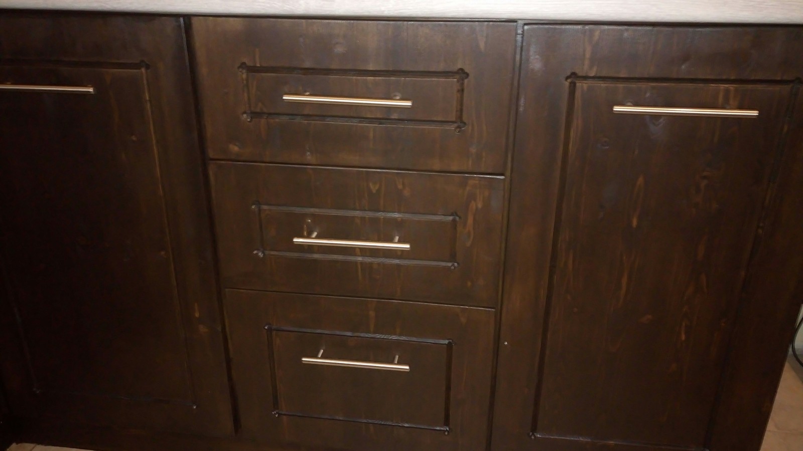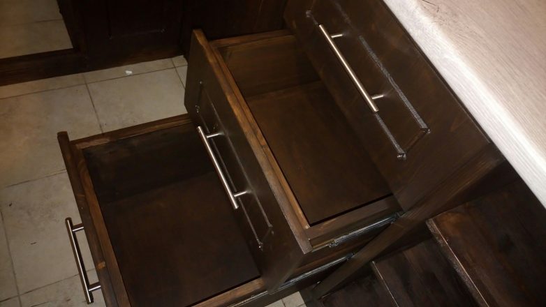 Собственно осталось установить варочную панель с духовкой и ящик под духовкой – и низ готов. С учётом всех расходников на низ и верх получилось очень даже бюджетно – около 60 тысяч деревянных, при том, что 20 с хвостом из них ушли на инструменты (это естественно без учёта стоимости плиты и вытяжки). При этом в мебельных салонах аналогичный гарнитур из ЛДСП стоит 120-145 тысяч. Исполнение же в дереве обойдётся уже в 220+.
