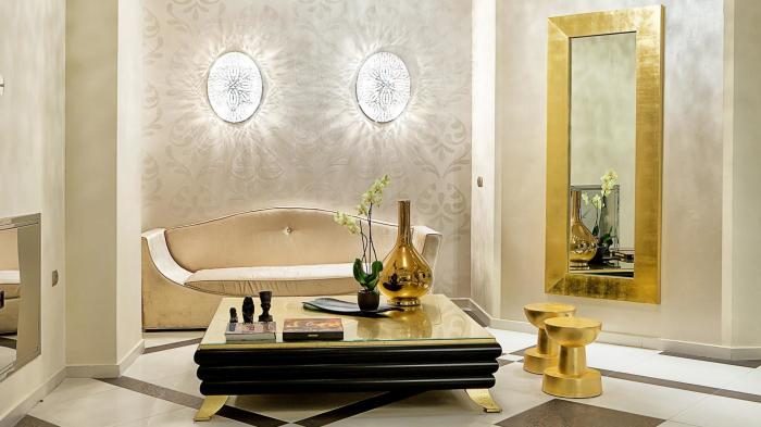 При выборе золотых цветов и оттенков стоит уделить особое внимание деталям и материалам. Выбирайте сталь, мрамор, дерево, а так же блестящую и матовую латунь. Всё это позволит с лёгкостью сочетать между собой другие элементы декора при оформлении интерьера.