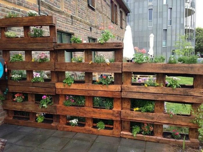 Используйте паллеты для зонирования участка. Помимо функционального назначения такая изгородь может выполнять и декоративную функцию. Части поддонов можно использовать для выращивания небольших растений и цветов.