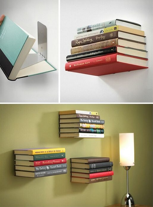 Когда в доме библиотека внушительных размеров и она постоянно расширяется, то возникает вопрос, как и где хранить большое количество книг. Можно использовать металлический держатель, который позволит создать интересный эффект. Будет казаться, что стопки с книгами словно парят в воздухе.