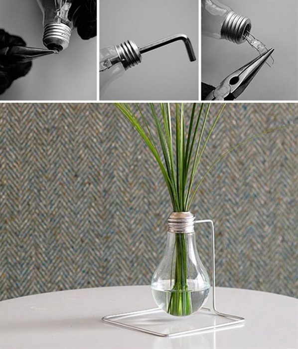 Лампа накаливания найдётся практически в каждом доме, а если она уже не функционирует, то такой предмет будет вам как-раз кстати. Просто аккуратно уберите из неё внутреннее наполнение, снимите верхнюю «шапочку». Дело за малым, сделайте подставку из прочной алюминиевой проволоки, закрепите на неё лампу – стильная и оригинальная ваза готова!
