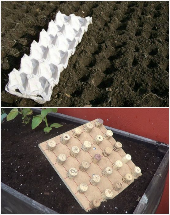 Фанеру, с приклеенными к ней винными пробками, или картонную упаковку для яиц можно использовать в качестве инструмента для создания лунок. Такой инструмент позволит сделать одновременно несколько лунок одинаковой глубины для посева семян, чем значительно сэкономит время.