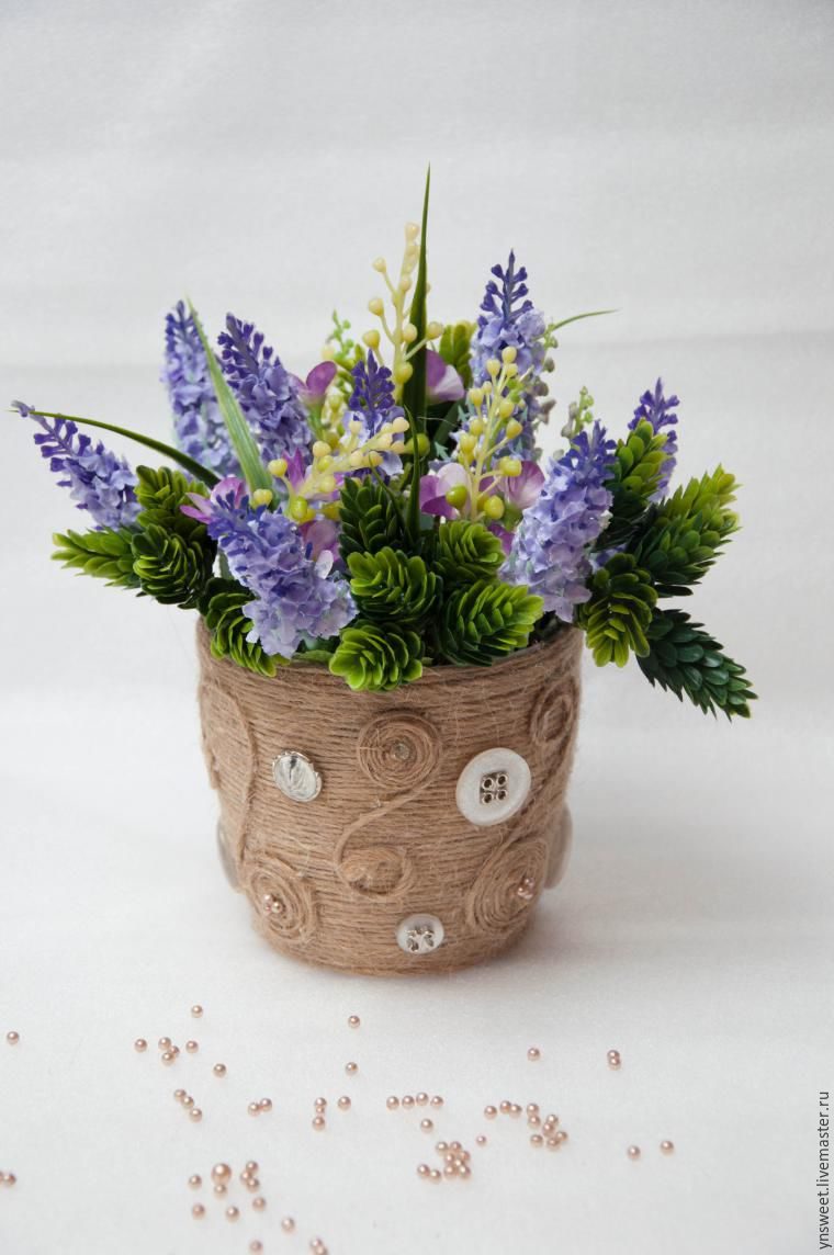 На первом этапе приклеиваем шпагат (бечевку) вокруг кашпо с помощью термоклея.