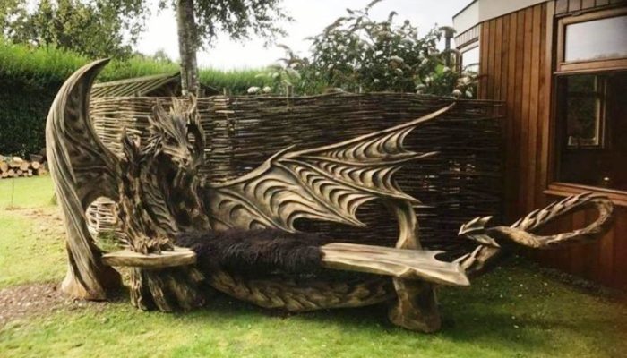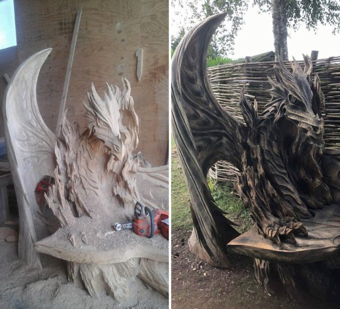 «Он берёт в руки бензопилу, и весь мир замирает, затаив дыхание...», — так можно начать рассказ об эстонском резчике по дереву Игоре Лоскутове, который при помощи столь сурового инструмента умудряется создавать изящно-хрупкие скульптуры. Чего только одна скамья с образом дракона стоит. Настоящий шедевр, сочетающий в себе огромное количество мельчайших деталей и линий, выполненных с филигранной точностью, что, глядя на такую работу трудно поверить в то, что она сделана ничем иным, как бензопилой. Вырезанная из дерева красота завораживает, поражая воображение. Что тут скажешь – мастер, несомненно, талантлив, а его творения – прямое тому подтверждение.