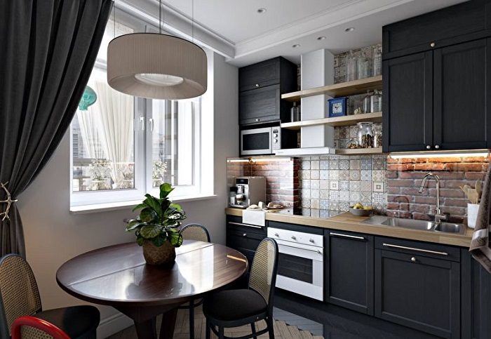 Цвет стен кухни — светлый, но темная мебель и темные шторы, сделают кухню более стильной и современной.