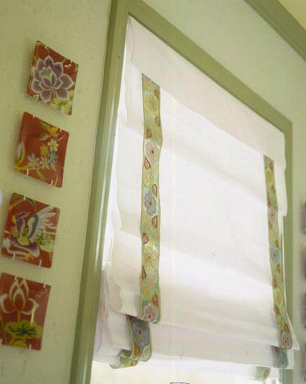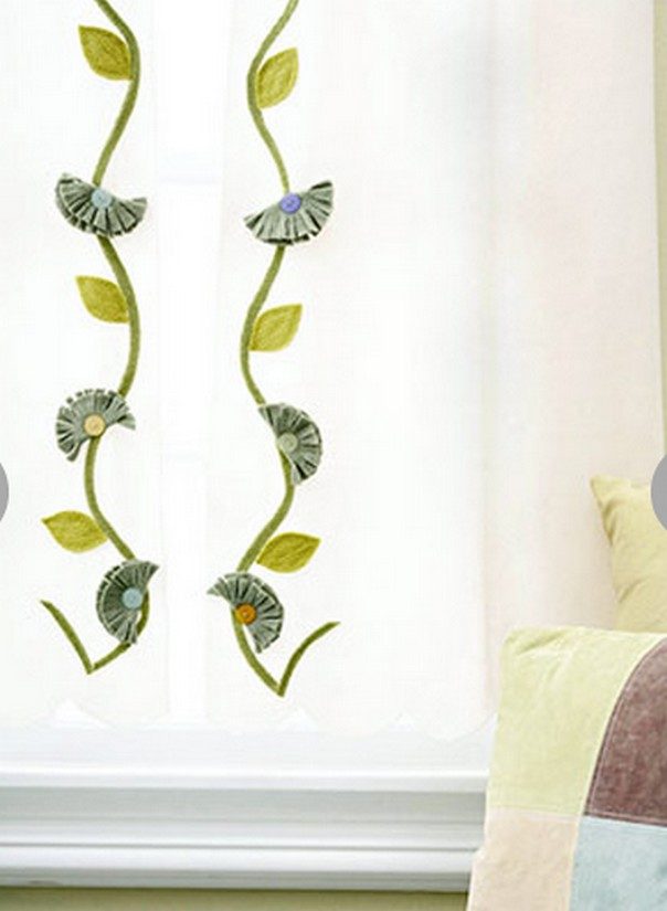 Прекрасно оживляют занавески, прошитые по краю ленты, к ним можно добавить различные пуговицы.