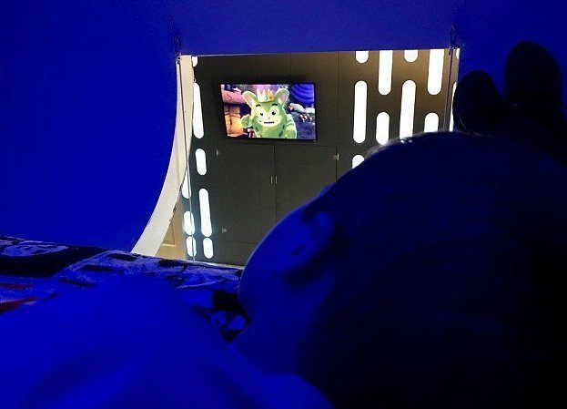 Чтобы порадовать своего пятилетнего сына — фаната «Звездных войн» — и заставить его пораньше ложиться спать, 30-летний Дерик Уинсет из Оклахома-сити сконструировал для него кровать в форме космического корабля «Сокол тысячелетия». Кровать висит под потолком, мигает огоньками и освещается изнутри голубым космическим светом. Теперь ребенка не приходится уговаривать лечь спать!