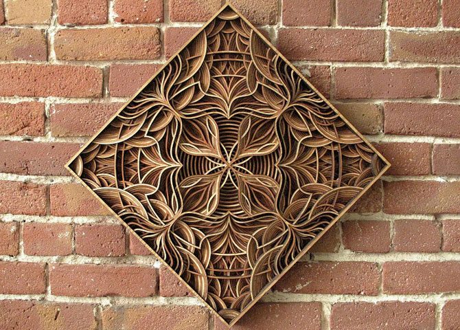 Это замечательное трёхмерное панно напоминает тибетскую мандалу, поражающую сложностью замысловатых узоров. Подобные запутанные сюрреалистические текстуры создаёт талантливый мастер, используя технику лазерного карвинга (вырезания) по дереву.