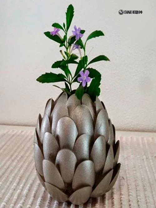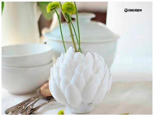 Ваза из ложек одноразовых получается в виде распустившегося цветка. От изменения цветовой гаммы ложек вы получите эксклюзивную, свою собственную вазу. А если еще в банку налить воды и поставить в нее красивый цветок, я уверяю, что такой поделки из одноразовой посуды вряд ли вы найдете у своих знакомых, а вот удивить их и позавидовать вам легко удастся.