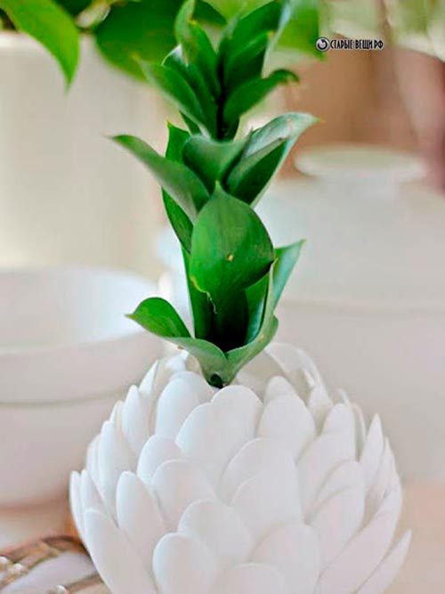 Отрезаем ручки от одноразовых ложек. Сразу оговорюсь, если вы захотите сделать вазу не белого цвета, то ложки нужно вначале покрасить или сразу приобрести цветные.