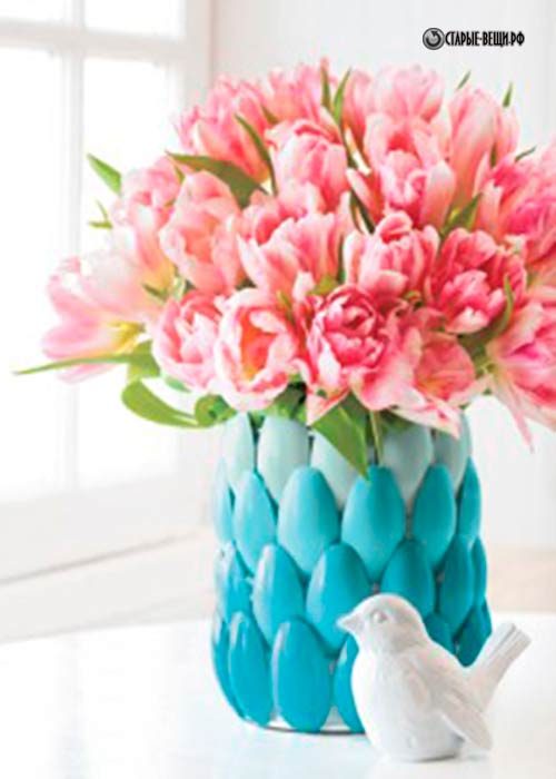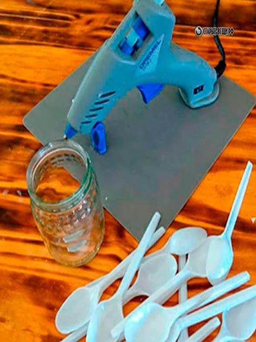 На стеклянную банку по окружности, размер вы подбираете сами, будем наклеивать с помощью клеевого пистолета ложки, начиная от верха банки и до основания.