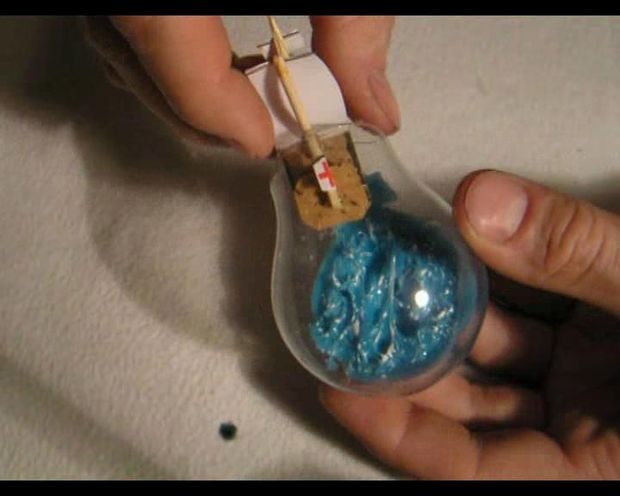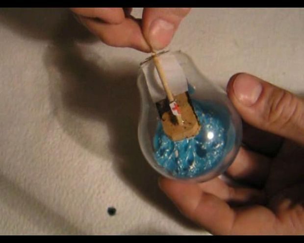 Создаем в колбе от лампочки имитацию воды при помощи голубого горячего клея.